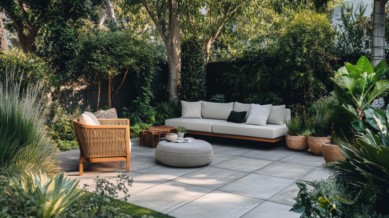 En cas de fissuration, il est important d’en identifier rapidement la cause, qu’il s’agisse d’un mouvement du sol, d’une charge excessive ou d’un défaut de mise en œuvre initial. Les bordures jouent un rôle de maintien essentiel en contenant latéralement les dalles et en préservant la géométrie de l’ensemble. Leur vérification et leur consolidation éventuelle font partie intégrante d’un entretien complet. L’intégration de végétation autour des zones dallées contribue à atténuer l’effet de chaleur en été et à créer une transition harmonieuse entre les espaces minéraux et naturels du jardin. Cette approche s’inscrit dans une logique d’aménagement paysager équilibré, où les dalles béton pressé structurent l’espace tout en s’intégrant naturellement à leur environnement.